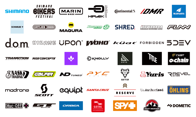 SHIMANO / SHIMANO BIKER’S FESTIVAL / MARIN BIKES / HIPLOK / Continental / DMR / Bluegrass / SCHWALBE / ORTLIEB / MAGURA / Reverse Components / SHRED / Kuwahara / FUNN / d.o.m. / HIRAME / UPON / Woho / Kuat Racks / FORBIDDEN BIKE / 5DEV / Transition Bikes / Ride Concepts / Formula / Knolly Bikes / TITLE MTB / akta MTB / Ochain CAST / Galfer / ND tuned / PYC Chain / WTB / YURIS / REVEL Bikes / Madrone / SCOTT / equipt / Santa Cruz Bicycles / RESERVE WHEELS / UnAuthorized / OHLINS / MUC-OFF / GT / ORBEA / GOTAL-TOKYO / SPY OPTIC / ROCKYMOUNTAIN / DOMETIC