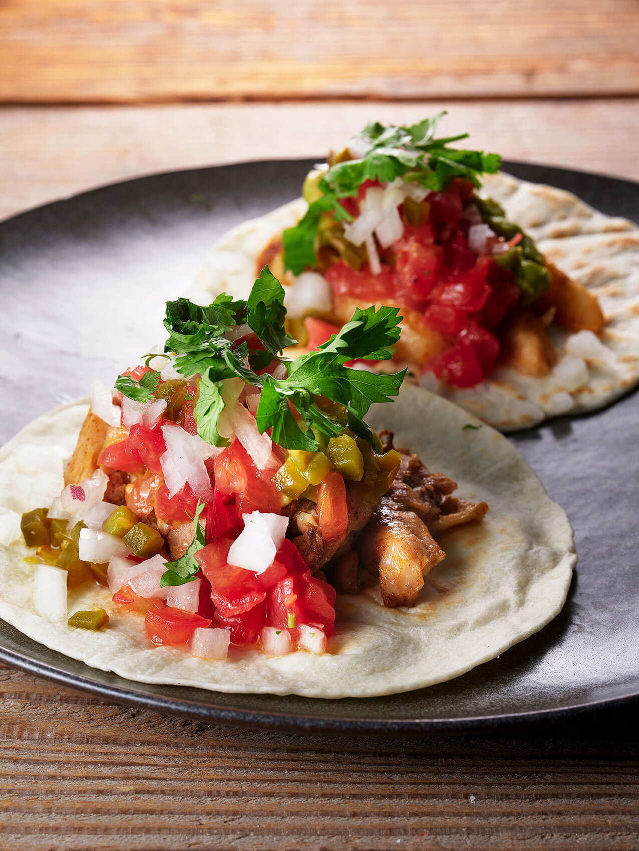 グリルチキンのタコス 2p 1200円店舗でも1番人気、スパイシーにグリルした国産鶏肉のタコス