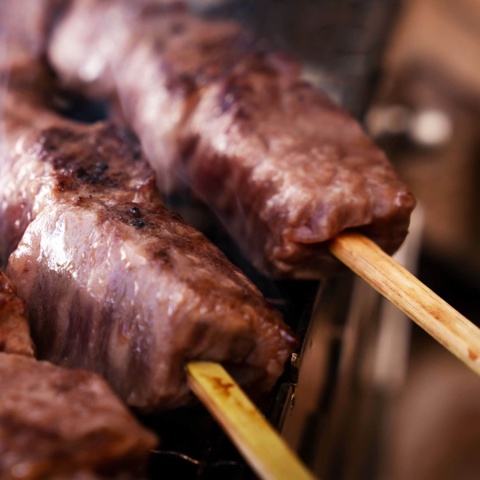 大麦仕上三元豚を使用したモチモチで脂まで美味しい炭火焼き豚丼や、食べ歩きに大人気の肉巻きおにぎり串等、香ばしい炭の香りをトッピングして焼き立て出来立てを提供いたします。