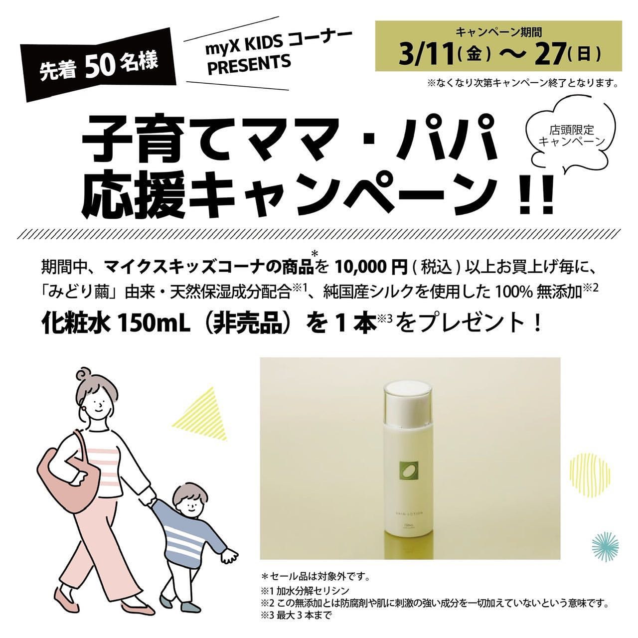 2022年3月2日 / 最終更新日時 : 2022年3月4日 myX編集者 キッズウェア 子育てママ・パパ応援キャンペーン📣📣 店頭にて先着50名様にマイクスキッズコーナーの商品* 10,000円(税込)以上お買い上げ毎に、「みどり繭」由来、天然保湿成分配合(※1)、純国産シルクを使用した100%無添加(※2) 化粧水150ml(非売品)を一本( […]